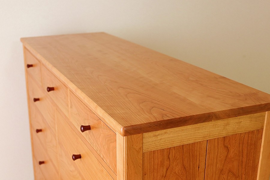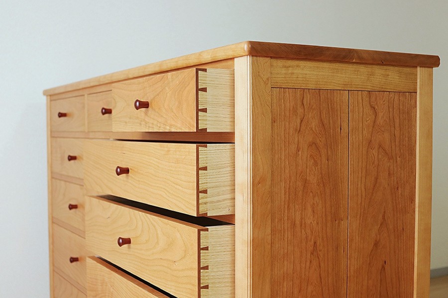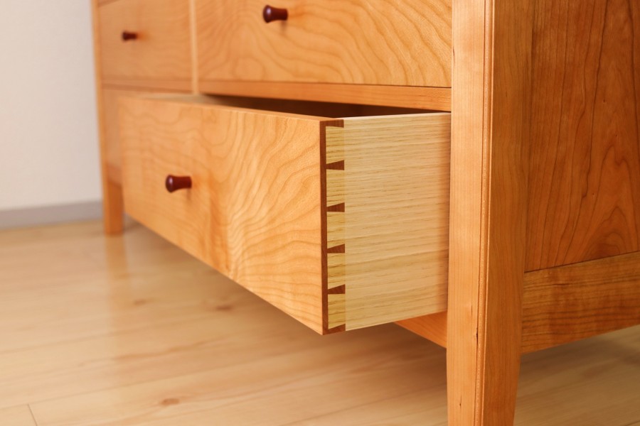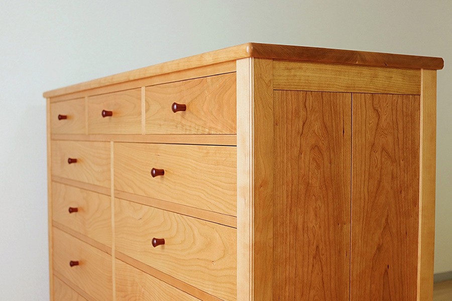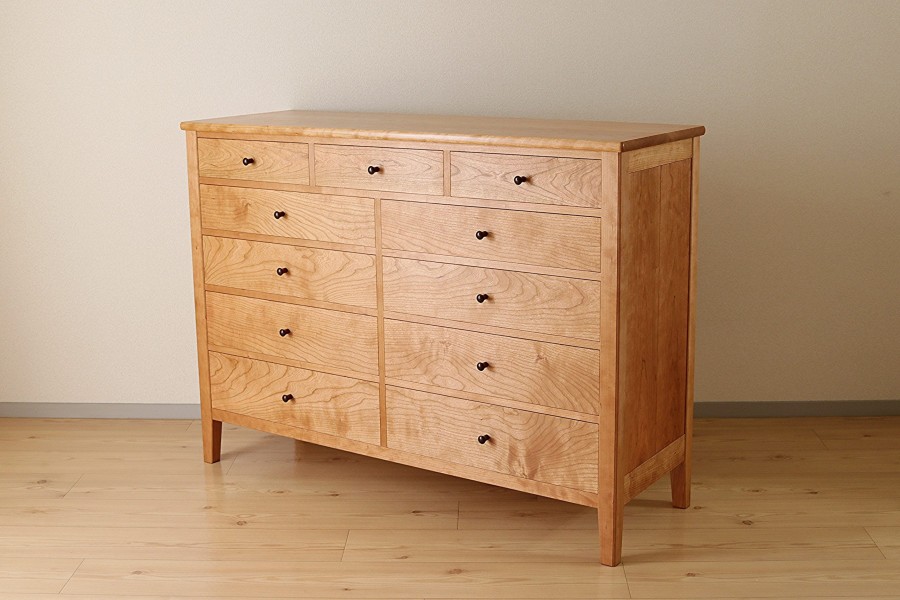 容量の大きなチェストです。美しいチェリーの木目に、削り出してつくったローズウッドのつまみがアクセントになっています。引出前板の木目をもとのままつなげて製作すると、一体感のある美しさが出ます。