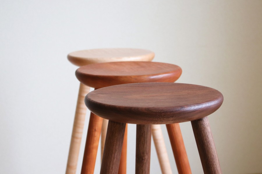丸い座面は少しくぼませてお尻のフィットを良くしています。三本脚なのでガタつかず、軽いので持ち運びも楽です。